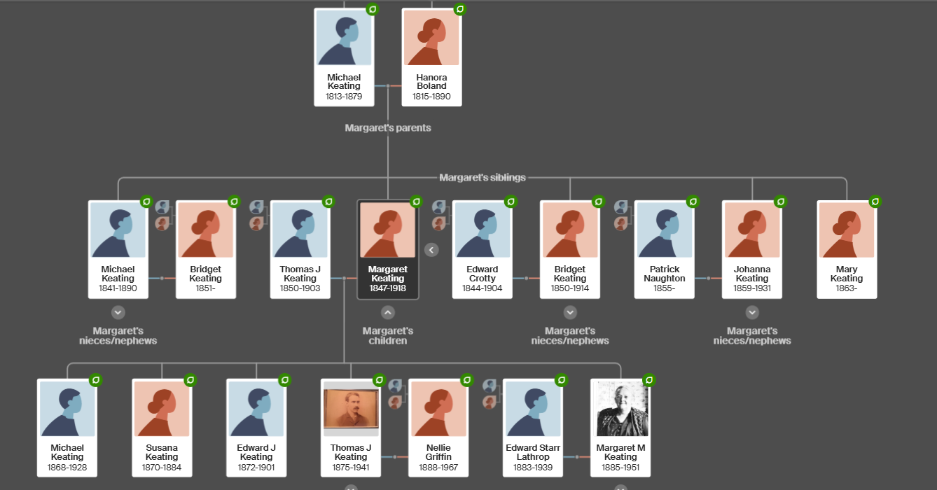 The following picture is The Keating family tree starting with my grandmother Margaret Keating Lathrop and her siblings and includes her mother’s family and her grandparents. We have yet to find her grandparents’ siblings or parents.