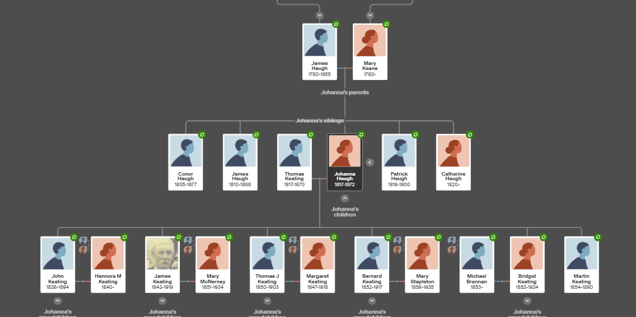 Note that the owner of the tree has been cut off the bottom because she is still alive. Also, note we had previously determined Johanna Haugh not only had father named James but also a brother James.
