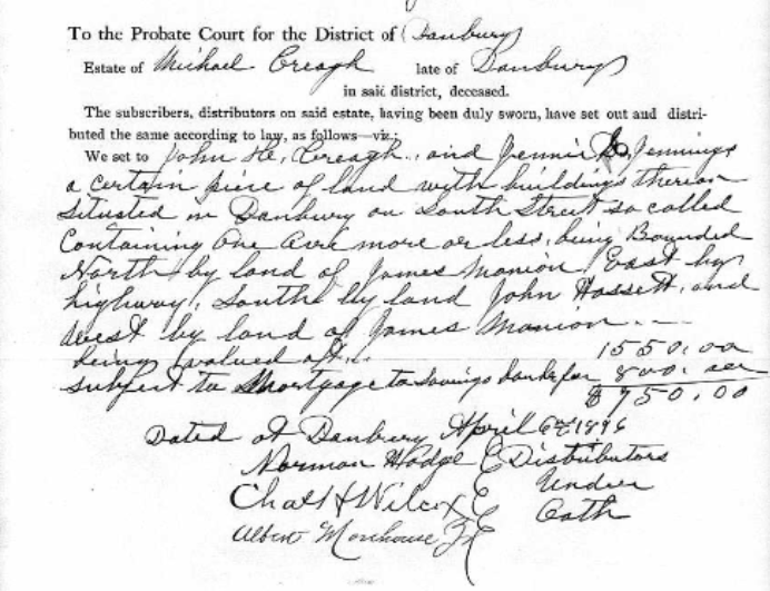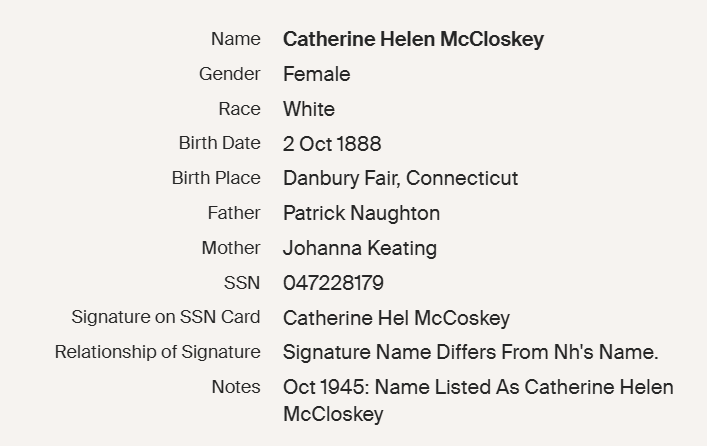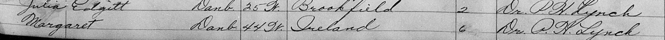 Patrick Naughton was also born in Ireland and, like a lot of Danburians of the time, he was a hat shop worker most of his life. Patrick and Johanna had two daughters, Mary and Catherine. I haven’t found very much information about Mary yet. Catherine married Thomas McCloskey.