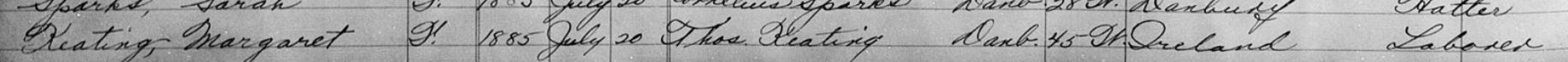 Because of his connection to the south side of Danbury and because of the lack of a “J” for his middle initial, I believe this Michael Keating was Michael J Keating’s father, my great-great grandfather, husband of Hanora Boland.