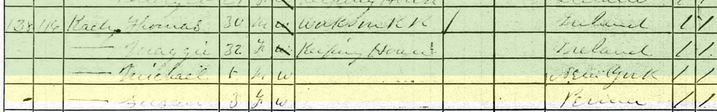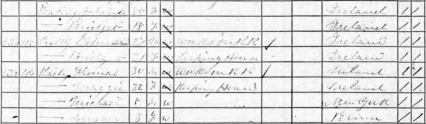 Even though the writing of the word “Joanna” in Bridget’s baptism record is fractured, we have all already determined this Thomas J Keating is my great grandfather and now we have established Thomas J Keating and the 18 year-old Bridget Keating Brennan in this census are brother – sister.