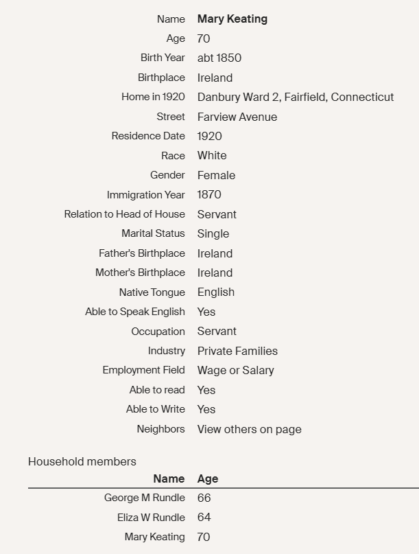 To complicate matters, in the life span of Miss Mary Keating, there were probably 10’s of thousands of Mary Keatings all living in Danbury, Connecticut! (slight exaggeration) I found an 1880 census where a 23 year old, single Mary Keating lived on 159 Main St in Danbury and was a servant by trade. I also found a 1920 census where a 70 year old, single woman named Mary Keating was a servant and she was working for and living in a house on Farview Ave. Farview Ave in Danbury, CT in 1920 was truly an upper-class neighborhood! I’m pretty sure this is our girl! We know she was single in 1918 and I couldn’t find another single Mary Keating near her age still living in the 1920 census in Danbury! The fact she aged 47 years in only 40 years means nothing in the world of historical censuses.