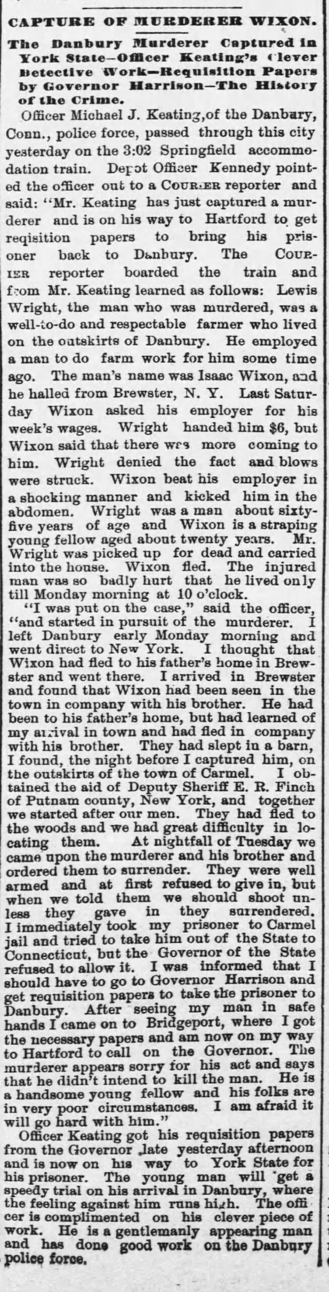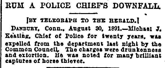 Though Michael J Keating tracked down a killer in June of 1886, legend has it his real forte was rounding up horse thieves. By the year 1888 things couldn’t have been going better for Michael! He was now the Chief of Police. However, things took a turn for the worse in 1891. Since I am his great-grandnephew, I believe I should have a chance to say what I think on the matter and what I think is that Michael J Keating was railroaded, BIG TIME!!! Every newspaper, in the country, it seems, ran with the story below. Typical of this story were the following two pieces of journalistic malpractice; the first from The Danbury News Times on August 29, 1891 and the second from the Stamford Advocate, September 4, 1891.