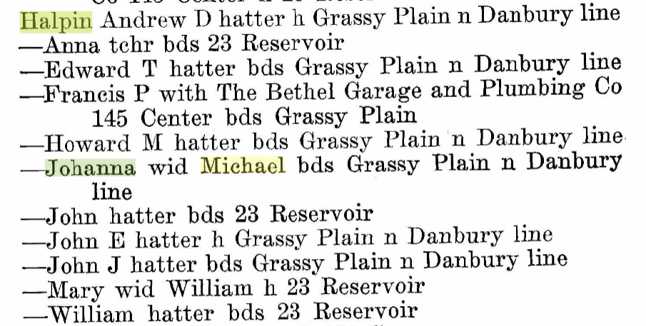 Actually, we can’t prove my great-great grandfather Michael Keating ever lived on South Bey Limits but some Michael Keating bought land there. The records are from sparse to nonexistent for both Michael Keating and Hanora Boland Keating. However, we did find a Michael Keating meandering around looking for property on the south side of Danbury and, lo and behold! we found a Hanora Keating living right there in South Bey Limits. Unfortunately, it looks like her husband wasn’t with her.