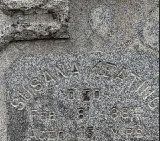 I actually drove over to St Peter’s Cemetery and took a picture of Susana’s resting place. Here is the picture I took. It looks to me like the girl in the Keating family in 1870 in Brokenstraw might just be our Susana. I say this, of course, because of the unusual spelling of her name.