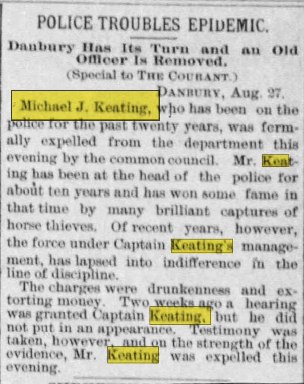 Because it was so difficult to determine Michael J Keating was part of my family tree, I have to wonder if all his bad press caused him to be ostracized by his family. If so, this would be a sad side note to what should have been a very happy story! In any event, now we know about Michael J Keating, Danbury Chief of Police, a man whose honesty wasn’t appreciated or even tolerated by the elders of his day.