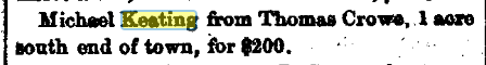 Either this property didn’t actually border any of Michael Hapline’s property or Michael Keating sold it to one of the people mentioned as land owners in Michael Hapline’s will. Though the Keating property on Manion’s lane was close to 2 acres of land, in 1800s, if land was between 1 and 2 acres, it was a 1 acre plot.