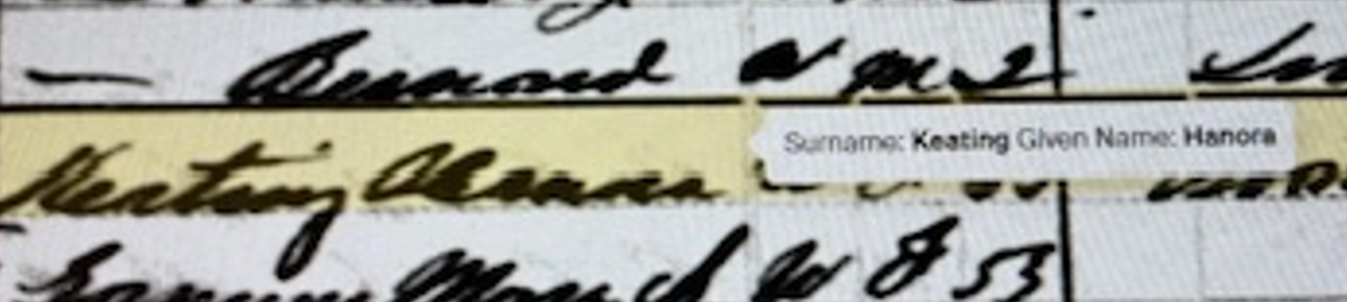 The picture above is of a blown up piece of the 1880 census. In it, you will see the name Keating and maybe the first name will look like Hanora if you have a good imagination. However, in the cloud that appears when you hover your mouse over this written name, you see the name typewritten as Hanora Keating. The people who transcribe these ancient hand written documents into typed words are wonderful. It’s a hard job they have and they do it very well. I believe this transcriber got this one 100% correct when he or she typed it out as “Hanora Keating!”