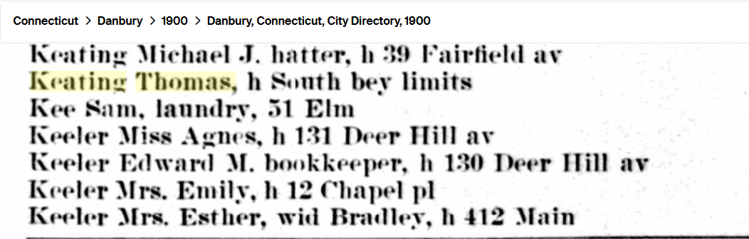 The Keating family connection to Danbury seems to have been on the Margaret Keating side of the family. Even her parents Michael and Hanora were in Danbury until their assumed deaths. Margaret had her 3 sisters, Bridget, Johanna and Mary, living pretty much in the neighborhood. She even had a first cousin, Martin E Keating, who she seemed to be close to, living just a stone’s throw away. Without a doubt, they all met every Sunday morning at St. Peter’s Church, and if they were anything like any Irish family I ever knew, they got together right after mass to have a few beers. BUT… What about Thomas Keating? Was he an only child??? No Emphatically! He was not!