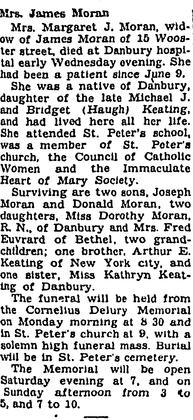 Next, we need to confirm Johanna Keating was Margaret Keating’s sister. The following article I found while scrolling a film strip at the Danbury Museum. If it looks like it had a light bulb shinning through the back of it, that’s because it had a light bulb shinning through the back 0f it. Finding any information about Margaret Keating Keating is very difficult. This is one of the reasons I think this obituary is an absolute treasure! It was in the Danbury News Times on April 23, 1918.
