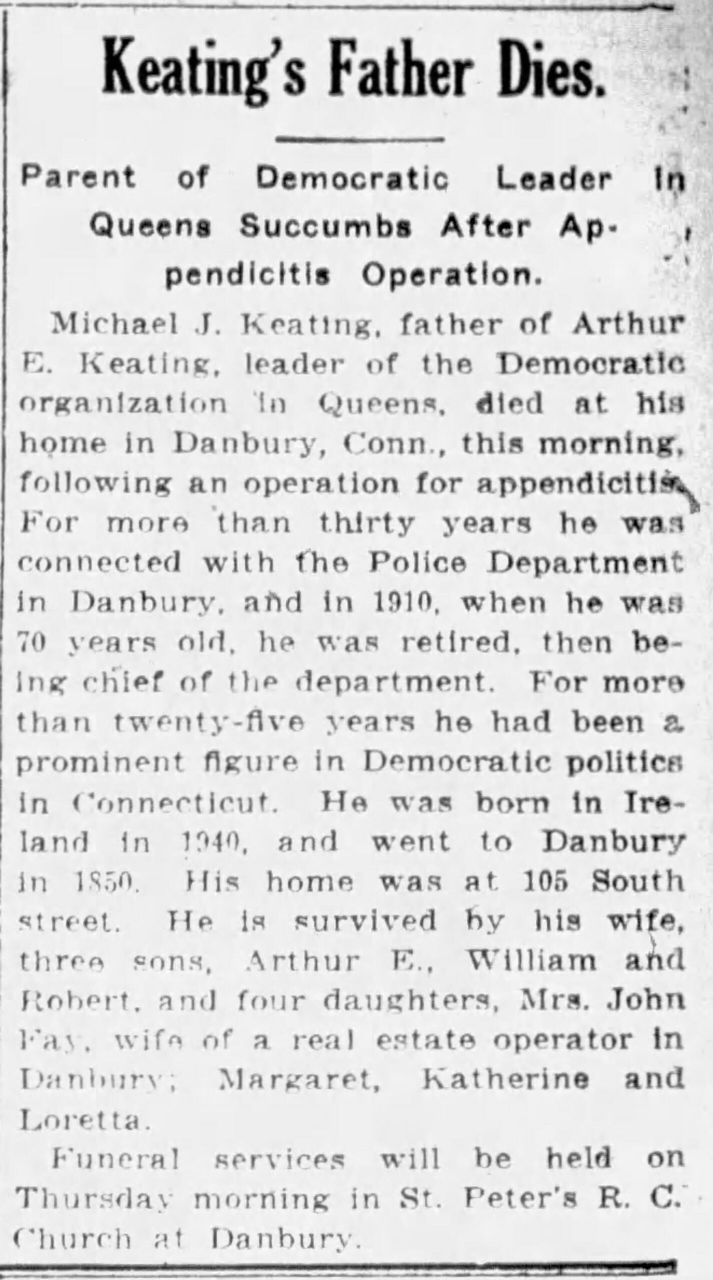 Michael J’s oldest son was Arthur E Keating. He was born in 1869 and died in 1958. He lived most of his life in Queens New York. Though he was an M.D., his claim to fame was that of of Democrat Party Leader. I guess you could say he was a party boss. Arthur’s Obituary was quite mundane as he didn’t have a, large family, but when his dad, Michael J died, Arthur’s New York City friends wrote a real humdinger of an obit for him. I wouldn’t say it was 100% true but it’s really worth reading, that’s for sure, and it really does put a positive light on Michael J Keating! It is from The Brooklyn Daily Times and shows us how loose with the facts the press used to be. (I had to have a shot of whiskey before I could type the phrase “used to be!”)