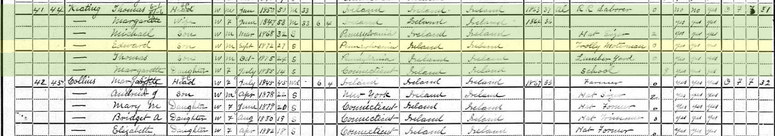 Also notice that in the 1900 census Thomas and Margaret Keating’s children were said to have been born in Pennsylvania. Margaret was born in Connecticut.
