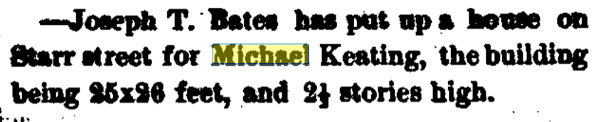 There was a tailor named Patrick Keating. He and his family lived on Cottage St. He was born in 1828. When I first discovered him, I thought he was Martin E Keating’s father. However, it didn’t turn out that way. Martin was a County Clare boy. From the little we know about Patrick, it looks like he was born in Tipperary. Tipperary and Clare border one another. So, even though in this case it isn’t a long, long way to Tipperary, we can conclude Patrick is not immediate family. He was a really cool guy, for sure, but not a great-granduncle or anything like that!