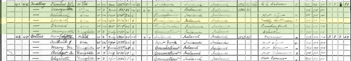 Also notice that in the 1900 census, Thomas and Margaret Keating’s children were said to have been born in Pennsylvania. Margaret was born in Connecticut.