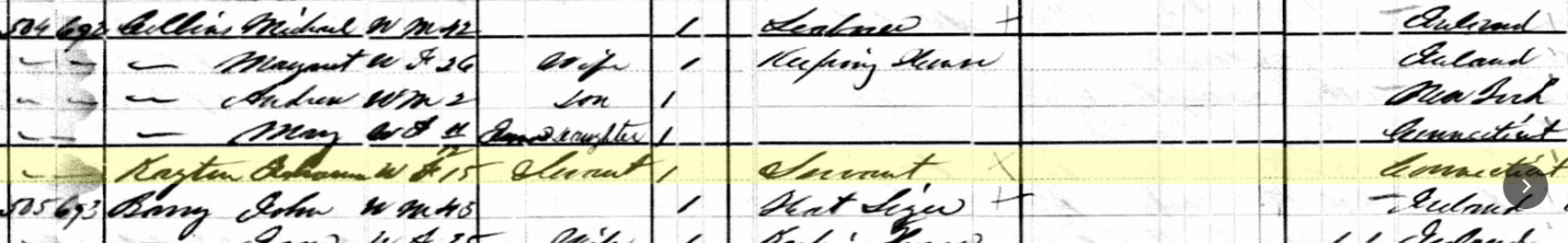 The following is the 1900 Keating family census. The family was said to live in South Bey Limits, Danbury Township, Connecticut. This also shows the Collins household next door. In another decade or so, this would become the Stone’s house.