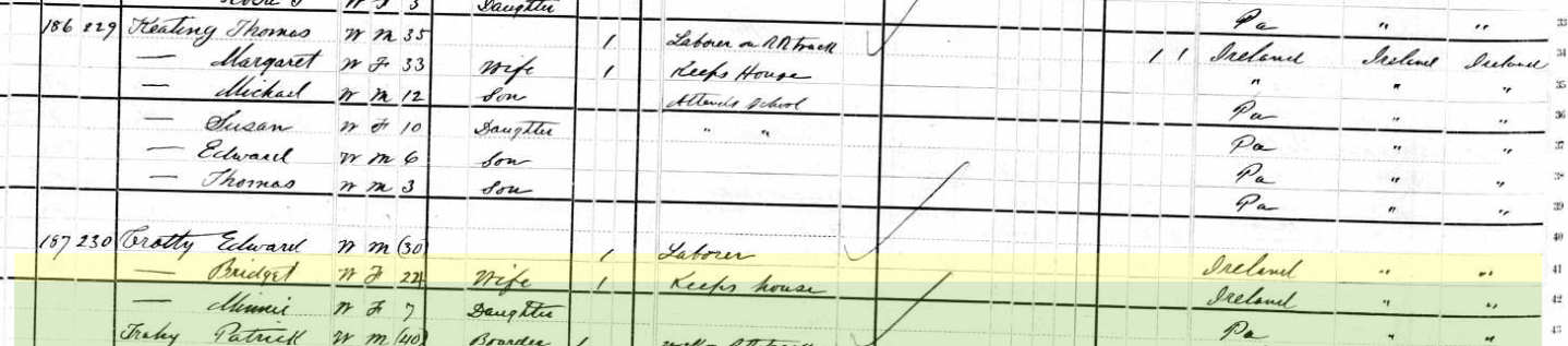 The next door neighbors are Edward and Bridget Crotty. Now lets look at the 1880 census from nearby Ralston, Pennsylvania and please excuse the fact it is crooked.
