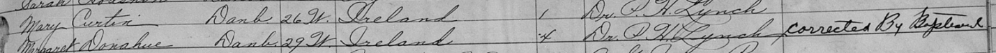Though baptism and birth dates can be considerably different, they are not usually far different when the baptism took place in Ireland. Johanna’s 1910 census says she was 50 at that time and her 1920 census says she was 60. These censuses with the baptism record probably give us a more accurate indication of when she was born than her marriage record does and it was probably 1860.
