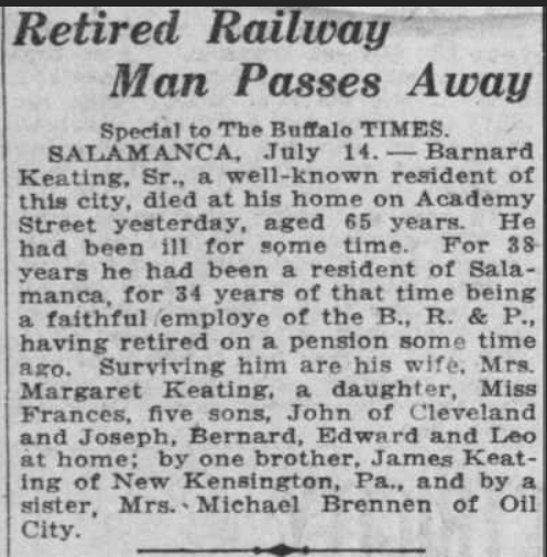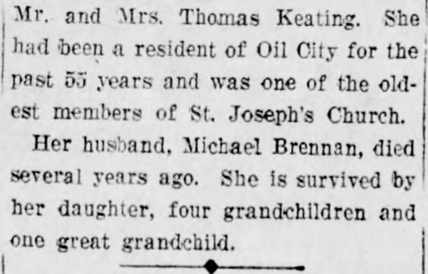 Now, let’s go ahead a few years and take a look at this Bridget Keating’s obituary. At the time of her death she was Bridget Brennan or, Mrs Michael Brennan and she lived in Oil City, Pennsylvania.