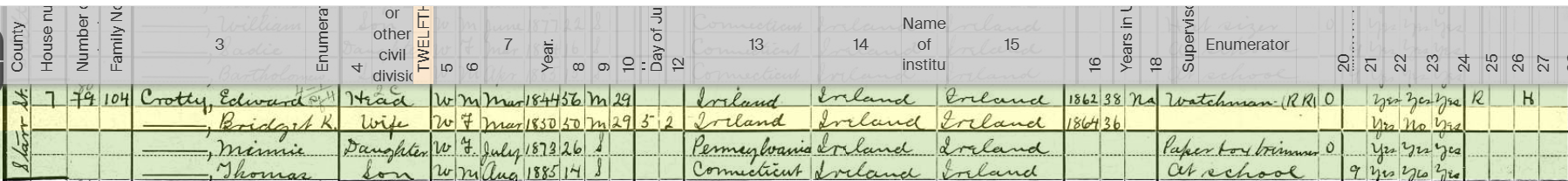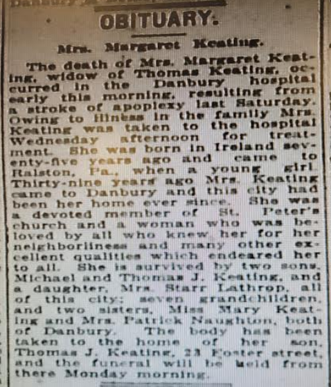 We have to remember though, my grandmother Margaret “Ma” Keating Lathrop was born in 1885, in Connecticut. With Johanna and Mary Keating arriving in Danbury in the early 1880s, it is like they did so by design. It is also likely Margaret Keating Keating, with her family, and Bridget Keating Crotty, with her family, did so by design too.