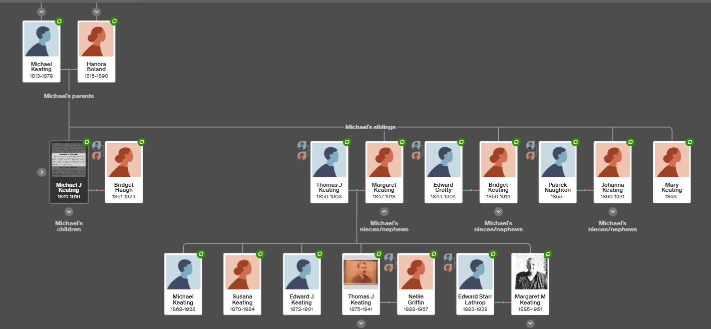 And … the following is the Michael and Hanora Boland Keating Family Tree showing Margaret Keating Keating, her siblings, parents and the children of Margaret and Thomas Keating.