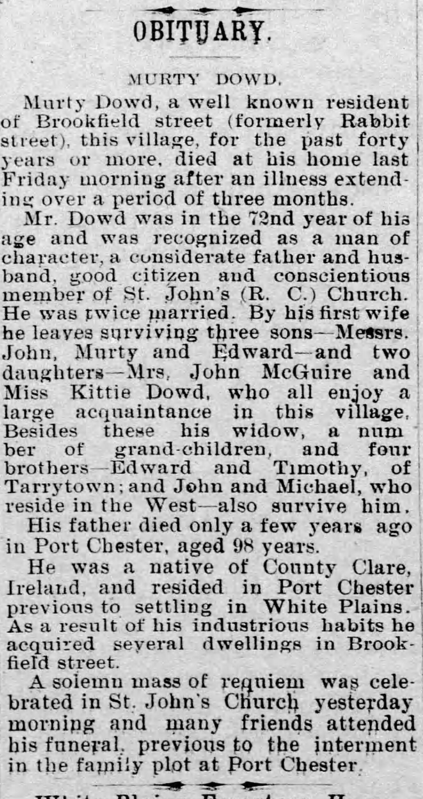 To end the story, at least, for now, we will once again refer to the 1870 Brokenstraw census. You will see, listed in between some Keating families, there was a guy named “Murty Dowd.” The original Irish name for which Murty was the nickname was Muircheartach. I have no idea how one would pronounce that name! Thankfully, through the years it was shortened to Murtagh. Murty was married to Mary Mirthe. She was the sister of their next door neighbor in the 1870 census, Michael Mirthe. We can’t find anything on the Mirthe family. Maybe the name is misspelled. Dowd, on the other hand was a very popular County Clare name. Perhaps the Keatings and Dowds are related somewhere along the line because that would explain what the Dowds were doing on a census page dominated by the Keating family. In any event, Muircheartach did alright in life. He ended up in White Plains, New York and I even found his obituary.
