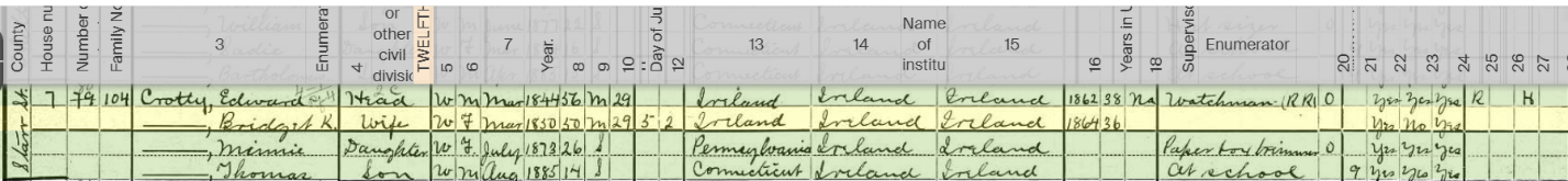 Here we have Edward Crotty, now 56 years old. He was 27 in 1870, so that squares. Also, we see Bridget Keating now 50 years old. So, she got her 6 lost years back. Then, there’s Minnie, now 26. She was 7 in the last census 20 years ago. This very much looks like the family that was the Thomas Keating family’s neighbors for many years. In 1900, they weren’t exactly next door neighbors but they lived on Starr St. in Danbury, Connecticut which did (still does) connect South St to Triangle St. So, they lived about a 15 minute walk away from the Keatings who now lived in South Bey Limits on a road that would eventually become Manion’s Lane.