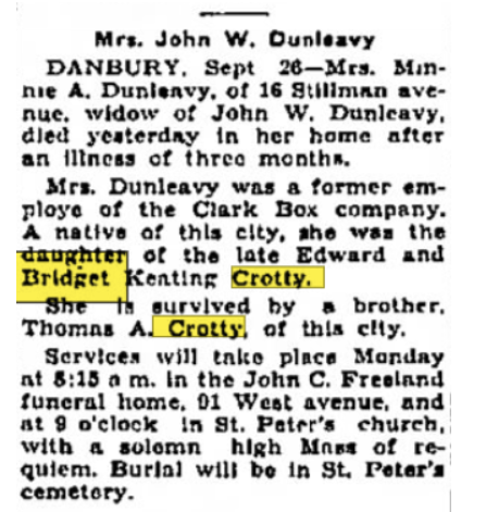 Also, we have enough information from the newspaper articles below and Johanna Keating’s baptism record from County Clare, Ireland, which is also below and we even have Johanna’s marriage record from town hall in Danbury, to boot! All of this put together show us Johanna Naughton, Margaret Keating and Bridget Crotty were sisters, for sure.